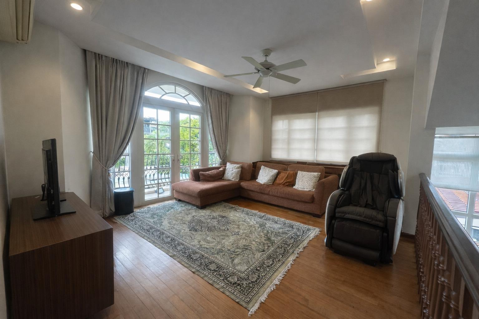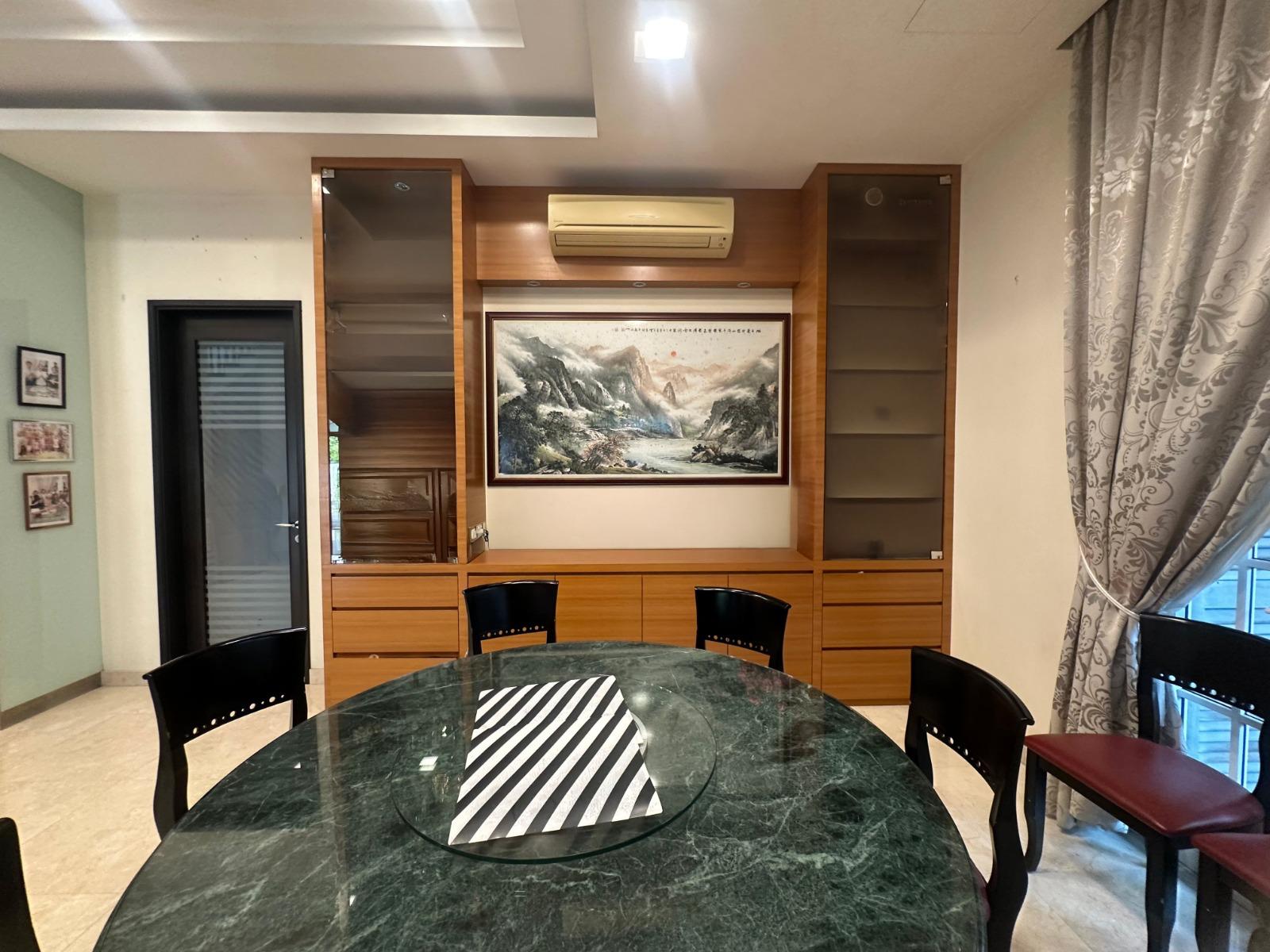 This house has a massive 7,815 sqft of floor area which includes the covered car porch and covered terraces. 1st story of this magnificent house is the entrance foyer, the living & dining areas (split-level) with high ceiling to give a glamorous feel. A guest room is located here with access to the common bathroom. There is also a spacious dry kitchen with a large central island counter and a wet kitchen together with the maid room/toilet. 2nd story comes with a large family area for the family's private time together. The huge master bedroom come with attached bathroom & balcony overseeing the green lawn. There is a junior master bedroom with ensuite bathroom and 2 other bedrooms.